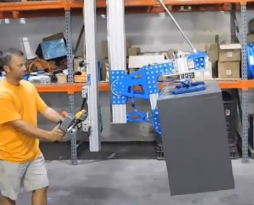 A vacuum lifter was installed into the work cell with adjustable cup end-tooling. This system provides for quick adjustment of cup spacing, allowing the operator to lift and stack the full range of pallets that are manufactured.